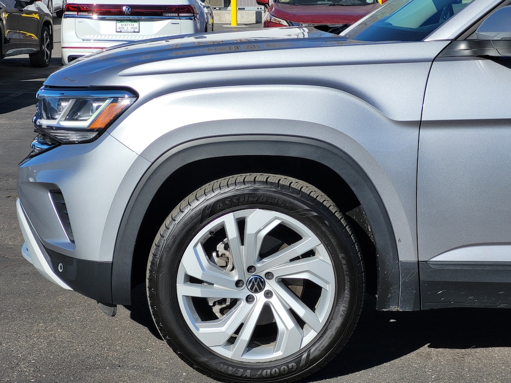 Panoramic Sunroof Package (Power Tilting & Sliding Panoramic Sunroof), Trailer Hitch Extras, Atlas 3.6L V6 SE w/Technology, Volkswagen Certified Pre-Owned Certified, 4D Sport Utility, 3.6L VR6, 8-Speed Automatic with Tiptronic, AWD, Pyrite Silver Metallic, Titan Black w/Quartz w/Perforated Vienna Leather Seating Surfaces, Active Cruise Control, Heated Comfort Front Bucket Seats, Rain sensing wipers, 3.60 Axle Ratio, 3rd row seats: split-bench, 4-Wheel Disc Brakes, 6 Speakers, ABS brakes, Air Conditioning, Alloy wheels, AM/FM radio: SiriusXM with 360L, Auto-Dimming Rear-View Mirror, Auto-dimming Rear-View mirror, Automatic temperature control, Brake assist, Bumpers: body-color, Compass, Delay-off headlights, Driver door bin, Driver vanity mirror, Dual front impact airbags, Dual front side impact airbags, Electronic Stability Control, Emergency communication system, Exterior Parking Camera Rear, Four wheel independent suspension, Front anti-roll bar, Front Bucket Seats, Front Center Armrest, Front dual zone A/C, Front fog lights, Front reading lights, Fully automatic headlights, Heated door mirrors, Heated front seats, Illuminated entry, Leather Shift Knob, Low tire pressure warning, Occupant sensing airbag, Outside temperature display, Overhead airbag, Overhead console, Panic alarm, Passenger door bin, Passenger vanity mirror, Perforated V-Tex Leatherette Seating Surfaces, Power door mirrors, Power driver seat, Power Liftgate, Power steering, Power windows, Privacy Cover, Radio data system, Radio: MIB3 Composition Media w/8 Touchscreen, Rear air conditioning, Rear anti-roll bar, Rear reading lights, Rear seat center armrest, Rear window defroster, Rear window wiper, Remote keyless entry, Roadside Assistance Kit, Roof rack: rails only, Rubber Mats Kit - Bench Seats, Security system, Speed control, Speed-sensing steering, Split folding rear seat, Spoiler, Standard Suspension, Steering wheel mounted audio controls, Tachometer, Telescoping steering wheel, Tilt steering wheel, Traction control, Trip computer, Trunk Liner w/VW CarGo Blocks, Turn signal indicator mirrors, Variably intermittent wipers, VW Car-Net Safe & Secure 5-Yr Prepaid Subscription, VW Care, and Wheels: 20 x 8J 5-Spoke Silver Painted Alloy. Odometer is 14947 miles below market average!
