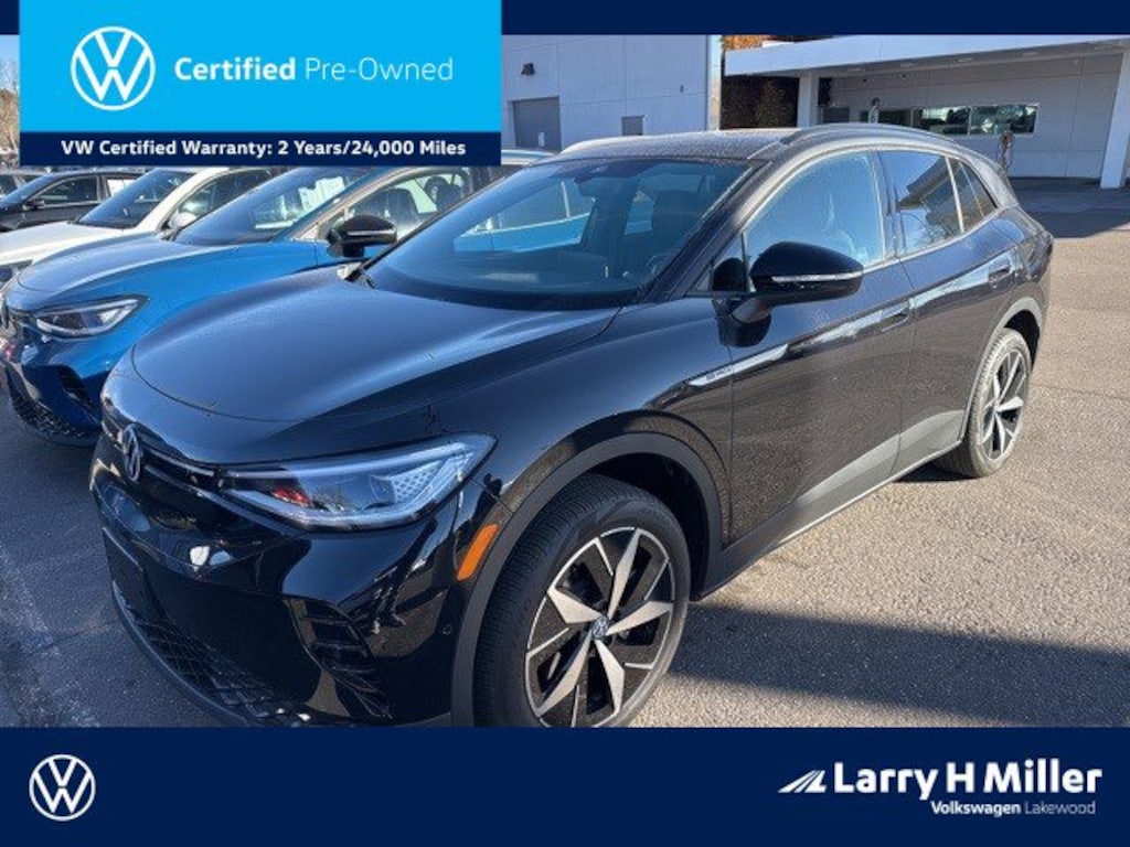 Charging & Interior Protection Package (2-in-1 (240V/120V) EV Charging Cable, EV Roadside Assistance Kit, First Aid Kit, Heavy Duty Trunk Liner w/VW CarGo Blocks, and Rubber Mats Kit), ID.4 Pro S, Volkswagen Certified Pre-Owned Certified, 4D Sport Utility, Electric Motor, Single-Speed Automatic, AWD, Deep Black Pearl, Gray w/Blue Bolsters w/Perforated V-Tex Leatherette Seating Surfaces, Active Cruise Control, Heated Front Seats, Heated steering wheel, Power Liftgate, Rain sensing wipers, 3.90 Axle Ratio, 4 Wheel Independent Suspension, 7 Speakers, ABS brakes, Air Conditioning, Alloy wheels, Auto High-beam Headlights, Auto-dimming Rear-View mirror, Automatic temperature control, Brake assist, Bumpers: body-color, Delay-off headlights, Driver door bin, Driver vanity mirror, Driver's Seat Mounted Armrest, Dual front impact airbags, Dual front side impact airbags, Electronic Stability Control, Emergency communication system: VW Car-Net Safe & Secure 5-year, Exterior Parking Camera Rear, Four wheel independent suspension, Front anti-roll bar, Front Bucket Seats, Front dual zone A/C, Front fog lights, Front reading lights, Fully automatic headlights, Heated door mirrors, Heated front seats, Illuminated entry, Low tire pressure warning, Memory seat, Navigation System, Occupant sensing airbag, Outside temperature display, Overhead airbag, Overhead console, Panic alarm, Passenger door bin, Passenger seat mounted armrest, Passenger vanity mirror, Perforated V-Tex Leatherette Seating Surfaces, Power door mirrors, Power driver seat, Power passenger seat, Power steering, Power windows, Radio data system, Radio: Discover Pro Max w/12 Touchscreen Nav, Rear anti-roll bar, Rear reading lights, Rear seat center armrest, Rear window defroster, Rear window wiper, Remote keyless entry, Speed control, Speed-sensing steering, Split folding rear seat, Spoiler, Steering wheel mounted audio controls, Telescoping steering wheel, Tilt steering wheel, Traction control, Trip computer, Turn signal indicator mirrors, Variably intermittent wipers, and Wheels: 20 5-Spoke 2-Tone Machined Alloy. Recent Arrival! Odometer is 19086 miles below market average! 104/93 City/Highway MPG