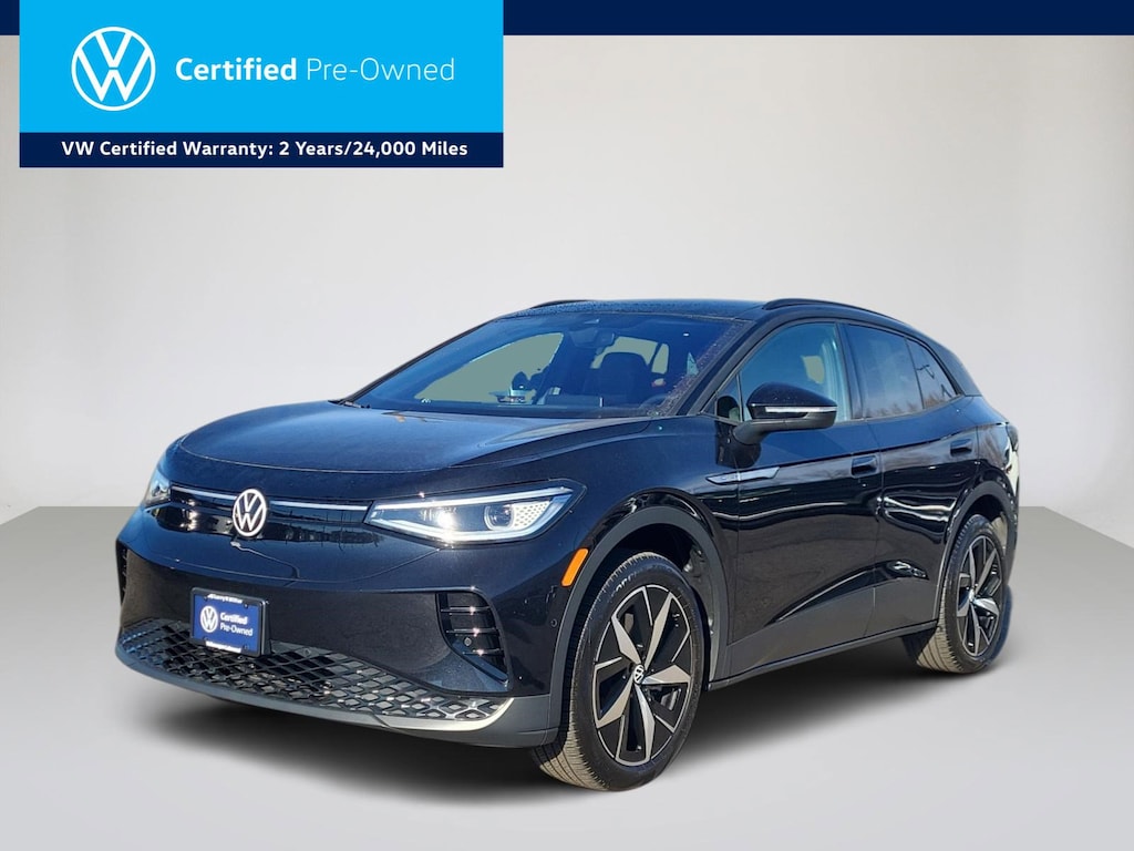 Charging & Interior Protection Package (2-in-1 (240V/120V) EV Charging Cable, EV Roadside Assistance Kit, First Aid Kit, Heavy Duty Trunk Liner w/VW CarGo Blocks, and Rubber Mats Kit), ID.4 Pro S, Volkswagen Certified Pre-Owned Certified, 4D Sport Utility, Electric Motor, Single-Speed Automatic, AWD, Deep Black Pearl, Gray w/Blue Bolsters w/Perforated V-Tex Leatherette Seating Surfaces, Active Cruise Control, Heated Front Seats, Heated steering wheel, Power Liftgate, Rain sensing wipers, 3.90 Axle Ratio, 4 Wheel Independent Suspension, 7 Speakers, ABS brakes, Air Conditioning, Alloy wheels, Auto High-beam Headlights, Auto-dimming Rear-View mirror, Automatic temperature control, Brake assist, Bumpers: body-color, Delay-off headlights, Driver door bin, Driver vanity mirror, Driver's Seat Mounted Armrest, Dual front impact airbags, Dual front side impact airbags, Electronic Stability Control, Emergency communication system: VW Car-Net Safe & Secure 5-year, Exterior Parking Camera Rear, Four wheel independent suspension, Front anti-roll bar, Front Bucket Seats, Front dual zone A/C, Front fog lights, Front reading lights, Fully automatic headlights, Heated door mirrors, Heated front seats, Illuminated entry, Low tire pressure warning, Memory seat, Navigation System, Occupant sensing airbag, Outside temperature display, Overhead airbag, Overhead console, Panic alarm, Passenger door bin, Passenger seat mounted armrest, Passenger vanity mirror, Perforated V-Tex Leatherette Seating Surfaces, Power door mirrors, Power driver seat, Power passenger seat, Power steering, Power windows, Radio data system, Radio: Discover Pro Max w/12 Touchscreen Nav, Rear anti-roll bar, Rear reading lights, Rear seat center armrest, Rear window defroster, Rear window wiper, Remote keyless entry, Speed control, Speed-sensing steering, Split folding rear seat, Spoiler, Steering wheel mounted audio controls, Telescoping steering wheel, Tilt steering wheel, Traction control, Trip computer, Turn signal indicator mirrors, Variably intermittent wipers, and Wheels: 20 5-Spoke 2-Tone Machined Alloy. Odometer is 9126 miles below market average! 104/93 City/Highway MPG