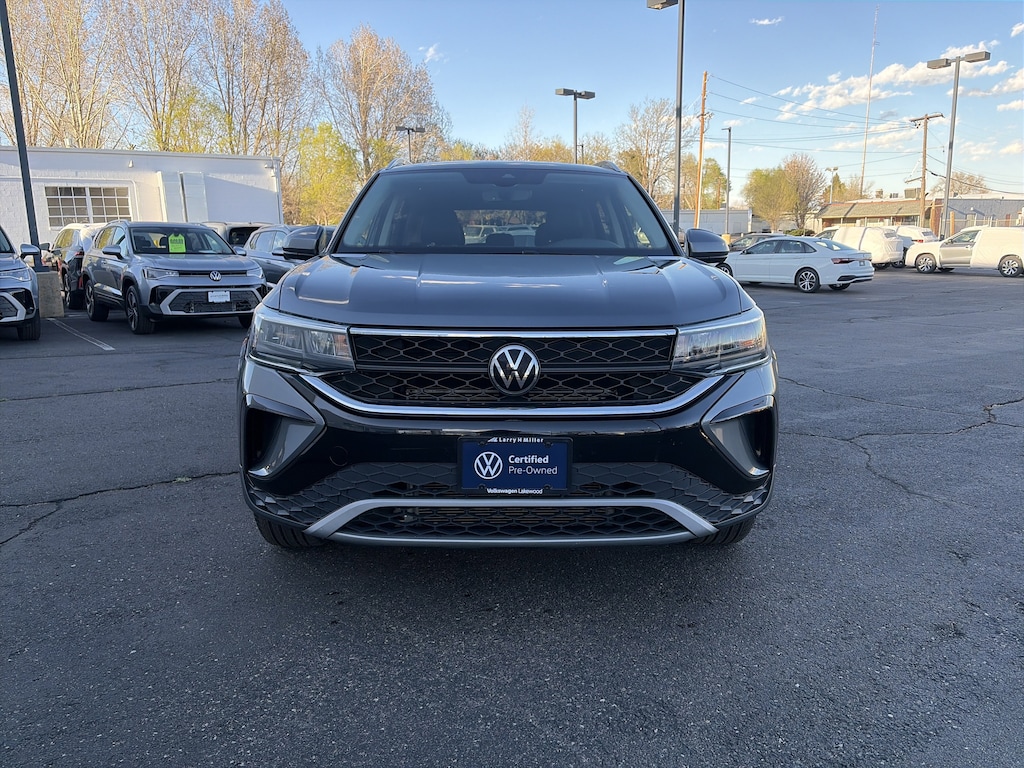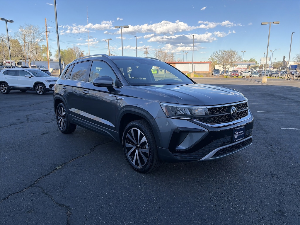 Panoramic Sunroof Package, Taos Protection Package (Mats & Liner) (Carpeted MojoMats (Set of 4) and Luggage Net), Taos 1.5T SE, Volkswagen Certified Pre-Owned Certified, 4D Sport Utility, 1.5L I4 Turbocharged DOHC 16V LEV3-SULEV30 158hp, 7-Speed DSG Automatic with Tiptronic, AWD, Platinum Gray Metallic, Black w/CloudTex & Cloth Seating Surfaces, Active Cruise Control, Heated Front Comfort Seats, Heated steering wheel, 4-Wheel Disc Brakes, 5.20 Axle Ratio, 6 Speakers, ABS brakes, Active Blind Spot Monitor, Air Conditioning, Alloy wheels, AM/FM radio: SiriusXM with 360L, Auto High-beam Headlights, Auto-Dimming Rearview Mirror (SRV), Brake assist, Bumpers: body-color, Chrome Bumperdillo Protection Plate for Rear Bumper, CloudTex & Cloth Seating Surfaces, Compass, Delay-off headlights, Driver door bin, Driver vanity mirror, Dual front impact airbags, Dual front side impact airbags, Electronic Stability Control, Emergency communication system: VW Car-Net Safe & Secure 5-year, Exterior Parking Camera Rear, Four wheel independent suspension, Front anti-roll bar, Front Bucket Seats, Front Center Armrest, Front reading lights, Front Strut Rear Multi-Link Suspension, Fully automatic headlights, Heated door mirrors, Heated front seats, Illuminated entry, Leather Shift Knob, Low tire pressure warning, Occupant sensing airbag, Outside temperature display, Overhead airbag, Overhead console, Panic alarm, Passenger door bin, Passenger vanity mirror, Power door mirrors, Power driver seat, Power steering, Power windows, Radio data system, Radio: MIB3 Composition Media AM/FM/HD, Rain sensing wipers, Rear anti-roll bar, Rear seat center armrest, Rear Sensors Credit, Rear window defroster, Rear window wiper, Remote keyless entry, Security system, Speed control, Speed-sensing steering, Split folding rear seat, Spoiler, Steering wheel mounted audio controls, Tachometer, Telescoping steering wheel, Tilt steering wheel, Traction control, Trip computer, Variably intermittent wipers, and Wheels: 18 2-Tone Machined Alloy. Recent Arrival! Odometer is 7610 miles below market average! 25/32 City/Highway MPG
