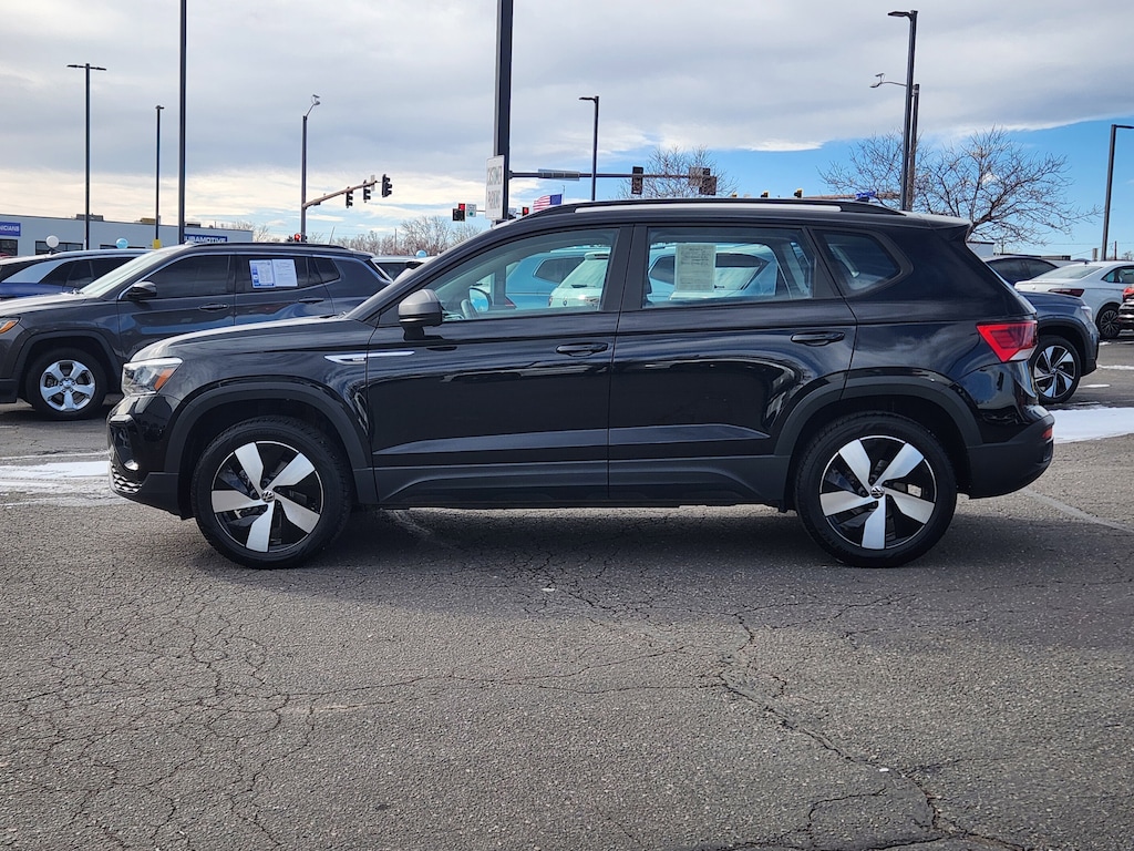 Convenience Features (Heated Leatherette-Wrapped Steering Wheel, Automatic Rain-Sensing Front Wipers, and Light Assist (High Beam Control For Headlights)), Driver Assistance Package (Adaptive Cruise Control (ACC) w/Stop & Go, Emergency Assist, Lane Assist (Lane Keeping System), and Travel Assist (Semi-Automated Driving Assistance)), S Convenience Package (Leather-Trimmed Shifter), Taos 1.5T S, Volkswagen Certified Pre-Owned Certified, 4D Sport Utility, 1.5L I4 Turbocharged DOHC 16V LEV3-SULEV30 158hp, 7-Speed DSG Automatic with Tiptronic, AWD, Deep Black Pearl, Gray/Black w/Cloth Seating Surfaces, Heated Front Bucket Seats, 18 Alloy Wheels, 4-Wheel Disc Brakes, 5.20 Axle Ratio, 6 Speakers, ABS brakes, Active Cruise Control, Air Conditioning, Alloy wheels, AM/FM radio, Brake assist, Bumpers: body-color, Cloth Seating Surfaces, Compass, Delay-off headlights, Driver door bin, Driver vanity mirror, Dual front impact airbags, Dual front side impact airbags, Electronic Stability Control, Emergency communication system: VW Car-Net Safe & Secure 5-year, Exterior Parking Camera Rear, Four wheel independent suspension, Front anti-roll bar, Front Bucket Seats, Front Center Armrest, Front reading lights, Front Strut Rear Multi-Link Suspension, Fully automatic headlights, Heated door mirrors, Heated front seats, Illuminated entry, Low tire pressure warning, Occupant sensing airbag, Outside temperature display, Overhead airbag, Overhead console, Panic alarm, Passenger door bin, Passenger vanity mirror, Power door mirrors, Power steering, Power windows, Radio data system, Radio: Composition Color AM/FM, Rear anti-roll bar, Rear seat center armrest, Rear window defroster, Rear window wiper, Remote keyless entry, Speed control, Speed-sensing steering, Split folding rear seat, Spoiler, Steering wheel mounted audio controls, Tachometer, Telescoping steering wheel, Tilt steering wheel, Traction control, Trip computer, and Variably intermittent wipers. Recent Arrival! Odometer is 5930 miles below market average! 25/32 City/Highway MPG