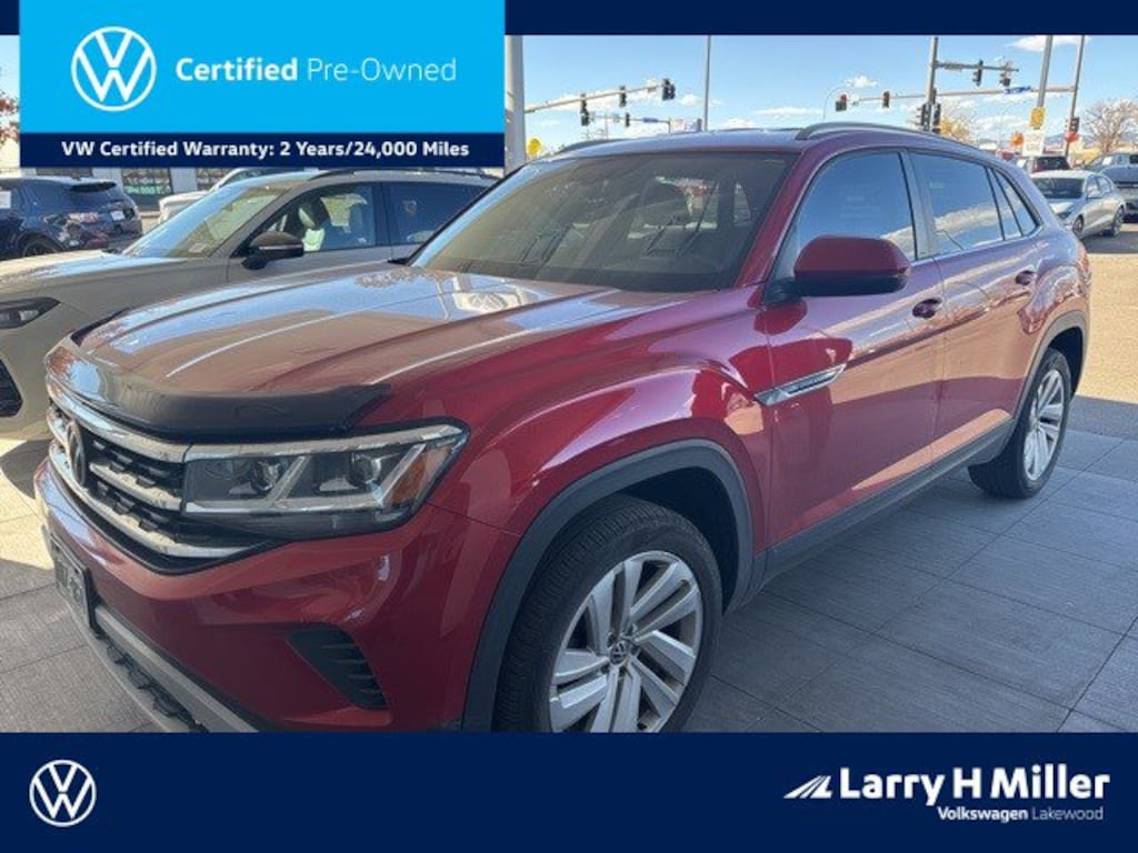 Atlas Cross Sport 2.0T SE w/Technology (A8), Volkswagen Certified Pre-Owned Certified, 4D Sport Utility, 2.0L TSI, 8-Speed Automatic with Tiptronic, AWD, Aurora Red Metallic, Titan Black w/Quartzite Accents w/Perforated Vienna Leather Seating Surfaces, Adaptive Cruise Control (ACC) w/Stop & Go, Heated Comfort Front Bucket Seats, Heated door mirrors, Rain sensing wipers, Remote Engine Start Feature, 3.60 Axle Ratio, 4-Wheel Disc Brakes, 6 Speakers, ABS brakes, Active Cruise Control, Air Conditioning, Alloy wheels, AM/FM radio: SiriusXM with 360L, Auto-dimming Rear-View mirror, Automatic temperature control, Brake assist, Bumpers: body-color, Compass, Delay-off headlights, Driver door bin, Driver vanity mirror, Dual front impact airbags, Dual front side impact airbags, Electronic Stability Control, Emergency communication system: VW Car-Net services (capabilities require enrollment or subscription), Exterior Parking Camera Rear, Four wheel independent suspension, Front anti-roll bar, Front Bucket Seats, Front Center Armrest, Front dual zone A/C, Front fog lights, Front reading lights, Fully automatic headlights, Heated front seats, Illuminated entry, Leather Shift Knob, Low tire pressure warning, Occupant sensing airbag, Outside temperature display, Overhead airbag, Overhead console, Panic alarm, Passenger door bin, Passenger vanity mirror, Perforated V-Tex Leatherette Seating Surfaces, Power door mirrors, Power driver seat, Power Liftgate, Power steering, Power windows, Radio data system, Radio: MIB3 Composition Media w/8 Touchscreen, Rear anti-roll bar, Rear reading lights, Rear seat center armrest, Rear window defroster, Rear window wiper, Remote keyless entry, Roof rack: rails only, Security system, Speed control, Speed-sensing steering, Split folding rear seat, Spoiler, Standard Suspension, Steering wheel mounted audio controls, Tachometer, Telescoping steering wheel, Tilt steering wheel, Traction control, Trip computer, Turn signal indicator mirrors, Variably intermittent wipers, and Wheels: 20 5-Spoke Silver Alloy (CQ0) Recent Arrival!