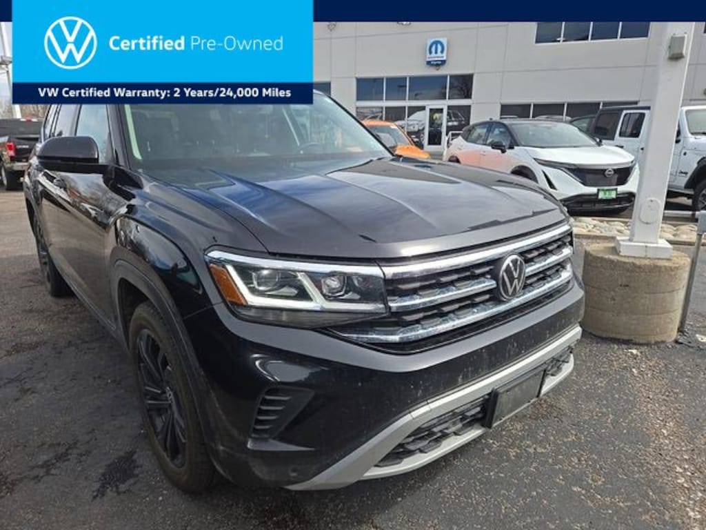 Black Wheel Package (Wheels: 20 x 8J 5-Spoke Black Painted Alloy), Panoramic Sunroof Package (Power Tilting & Sliding Panoramic Sunroof), Atlas MDO Package - Captain's Chairs (DISC) (Auto-Dimming Rear-View Mirror, Heavy Duty Trunk Liner w/VW CarGo Blocks, Privacy Cover, and Rubber Mats Kit - Captain's Chairs), Atlas Protection Package- Captain's Chairs (Carpeted Mats - Captain's Chairs, Carpeted Mats Kit - Captain's Chairs, and Luggage Net), Atlas Protection Package- Captain's Chairs (APL), Atlas 3.6L V6 SE w/Technology, Volkswagen Certified Pre-Owned Certified, 4D Sport Utility, 3.6L VR6, 8-Speed Automatic with Tiptronic, AWD, Deep Black Pearl, Titan Black w/Quartz w/Perforated Vienna Leather Seating Surfaces, 2nd-Row Dual Captain's Chairs, Heated Comfort Front Bucket Seats, Heated front seats, 3.60 Axle Ratio, 3rd row seats: split-bench, 4-Wheel Disc Brakes, 6 Speakers, ABS brakes, Air Conditioning, Alloy wheels, AM/FM radio: SiriusXM with 360L, Auto-dimming Rear-View mirror, Automatic temperature control, Brake assist, Bumpers: body-color, Compass, Delay-off headlights, Driver door bin, Driver vanity mirror, Dual front impact airbags, Dual front side impact airbags, Electronic Stability Control, Emergency communication system: VW Car-Net Safe & Secure 5-year, Exterior Parking Camera Rear, Four wheel independent suspension, Front anti-roll bar, Front Bucket Seats, Front Center Armrest, Front dual zone A/C, Front fog lights, Front reading lights, Fully automatic headlights, Heated door mirrors, Illuminated entry, Leather Shift Knob, Low tire pressure warning, Occupant sensing airbag, Outside temperature display, Overhead airbag, Overhead console, Panic alarm, Passenger door bin, Passenger vanity mirror, Perforated V-Tex Leatherette Seating Surfaces, Power door mirrors, Power driver seat, Power Liftgate, Power steering, Power windows, Radio data system, Radio: MIB3 Composition Media w/8 Touchscreen, Rain sensing wipers, Rear air conditioning, Rear anti-roll bar, Rear reading lights, Rear seat center armrest, Rear window defroster, Rear window wiper, Remote keyless entry, Security system, Speed control, Speed-sensing steering, Split folding rear seat, Spoiler, Standard Suspension, Steering wheel mounted audio controls, Tachometer, Telescoping steering wheel, Tilt steering wheel, Traction control, Trip computer, Turn signal indicator mirrors, Variably intermittent wipers, and Wheels: 20 x 8J 5-Spoke Silver Painted Alloy. Recent Arrival!