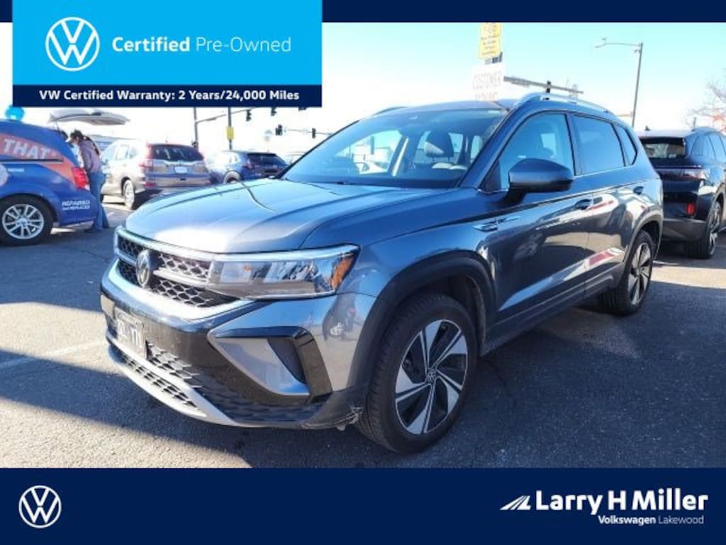 Taos 1.5T SE, Volkswagen Certified Pre-Owned Certified, 4D Sport Utility, 1.5L I4 Turbocharged DOHC 16V LEV3-SULEV30 158hp, 7-Speed DSG Automatic with Tiptronic, AWD, Platinum Gray Metallic, Gray/Black w/Leatherette & Cloth Seating Surfaces, Active Cruise Control, Heated Front Comfort Seats, Heated steering wheel, Rain sensing wipers, 4-Wheel Disc Brakes, 5.20 Axle Ratio, 6 Speakers, ABS brakes, Active Blind Spot Monitor, Air Conditioning, Alloy wheels, AM/FM radio: SiriusXM with 360L, Auto High-beam Headlights, Brake assist, Bumpers: body-color, CloudTex & Cloth Seating Surfaces, Compass, Delay-off headlights, Driver door bin, Driver vanity mirror, Dual front impact airbags, Dual front side impact airbags, Electronic Stability Control, Emergency communication system: VW Car-Net Safe & Secure 5-year, Exterior Parking Camera Rear, Four wheel independent suspension, Front anti-roll bar, Front Bucket Seats, Front Center Armrest, Front reading lights, Front Strut Rear Multi-Link Suspension, Fully automatic headlights, Heated door mirrors, Heated front seats, Illuminated entry, Leather Shift Knob, Low tire pressure warning, Occupant sensing airbag, Outside temperature display, Overhead airbag, Overhead console, Panic alarm, Passenger door bin, Passenger vanity mirror, Power door mirrors, Power driver seat, Power steering, Power windows, Radio data system, Radio: MIB3 Composition Media AM/FM/HD, Rear anti-roll bar, Rear seat center armrest, Rear window defroster, Rear window wiper, Remote keyless entry, Security system, Speed control, Speed-sensing steering, Split folding rear seat, Spoiler, Steering wheel mounted audio controls, Tachometer, Telescoping steering wheel, Tilt steering wheel, Traction control, Trip computer, Variably intermittent wipers, and Wheels: 18 2-Tone Machined Alloy. Recent Arrival! 25/32 City/Highway MPG