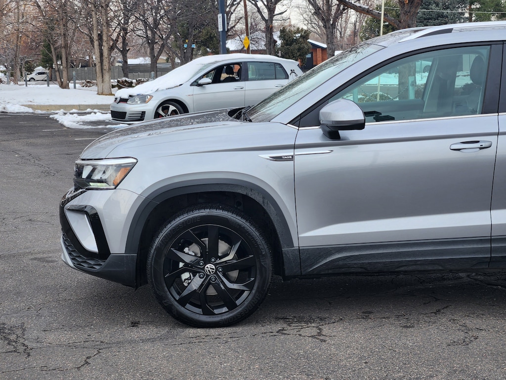 Pyrite Silver Metallic 2023 Volkswagen Taos 1.5T SE AWD 7-Speed DSG Automatic with Tiptronic 1.5L I4 Turbocharged DOHC 16V LEV3-SULEV30 158hp Clean Carfax, One Owner, Local Trade, AWD, 4WD, Apple Carplay / Android Auto, Bluetooth, Backup Camera, Blind Spot Monitor, Heated Seats, Taos 1.5T SE, 4D Sport Utility, 1.5L I4 Turbocharged DOHC 16V LEV3-SULEV30 158hp, 7-Speed DSG Automatic with Tiptronic, AWD, Pyrite Silver Metallic, Black w/CloudTex & Cloth Seating Surfaces, Black Wheel Package, Heated steering wheel, Panoramic Sunroof Package, Rain sensing wipers, Wheels: 18 Black Painted Alloy.