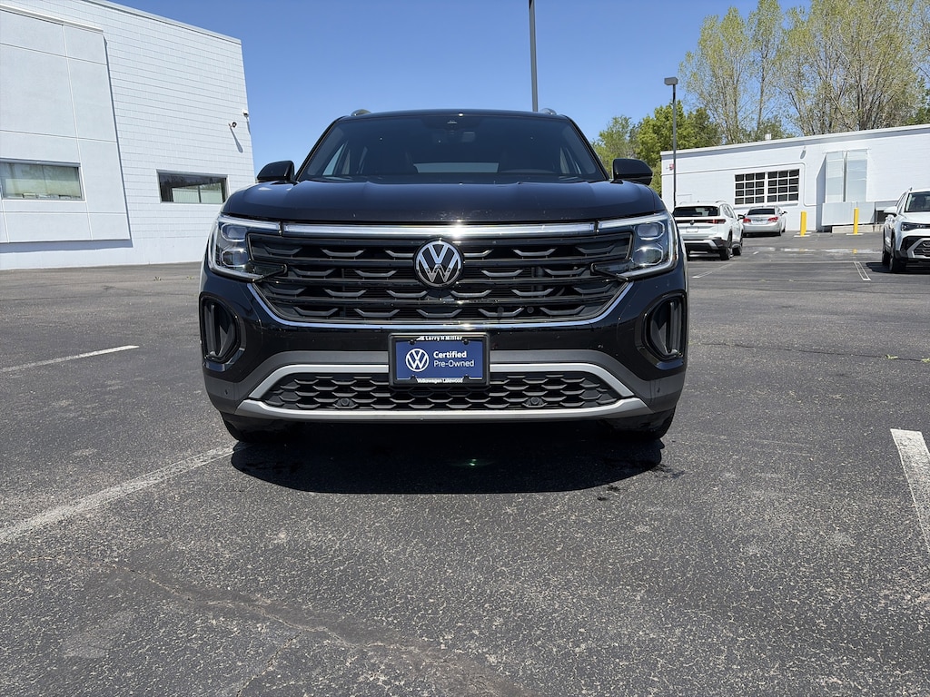 Black Wheel Package (Wheels: 20 Multi-Spoke Black Painted Alloy), Panoramic Sunroof Package (Power Tilting & Sliding Panoramic Sunroof), Atlas Cross Sport 2.0T SE w/Technology (A8), Volkswagen Certified Pre-Owned Certified, 4D Sport Utility, 2.0L TSI, 8-Speed Automatic with Tiptronic, AWD, Deep Black Pearl, Titan Black w/Perforated Vienna Leather Seating Surfaces, Heated & Actively Ventilated Front Seats, Heated steering wheel, 3.60 Axle Ratio, 4-Wheel Disc Brakes, 4-Wheel Independent Suspension, 6 Speakers, ABS brakes, Air Conditioning, Alloy wheels, AM/FM radio: SiriusXM with 360L, Auto-dimming Rear-View mirror, Automatic temperature control, Brake assist, Bumpers: body-color, Compass, Delay-off headlights, Driver door bin, Driver vanity mirror, Dual front impact airbags, Dual front side impact airbags, Electronic Stability Control, Emergency communication system: VW Car-Net Safe & Secure 5-year, Exterior Parking Camera Rear, Four wheel independent suspension, Front anti-roll bar, Front Bucket Seats, Front Center Armrest, Front dual zone A/C, Front fog lights, Front reading lights, Fully automatic headlights, Heated door mirrors, Heated front seats, Illuminated entry, Low tire pressure warning, Occupant sensing airbag, Outside temperature display, Overhead airbag, Overhead console, Panic alarm, Passenger door bin, Passenger vanity mirror, Perforated V-Tex Leatherette Seating Surfaces, Power door mirrors, Power driver seat, Power Liftgate, Power steering, Power windows, Radio data system, Radio: MIB3 Composition Media AM/FM/HD, Rain sensing wipers, Rear anti-roll bar, Rear reading lights, Rear seat center armrest, Rear window defroster, Rear window wiper, Remote keyless entry, Security system, Speed control, Speed-sensing steering, Split folding rear seat, Spoiler, Steering wheel mounted audio controls, Tachometer, Telescoping steering wheel, Tilt steering wheel, Traction control, Trip computer, Turn signal indicator mirrors, Variably intermittent wipers, Ventilated front seats, and Wheels: 20 5-Spoke 2-Tone Machined Alloy. Recent Arrival! Odometer is 10589 miles below market average! 19/26 City/Highway MPG